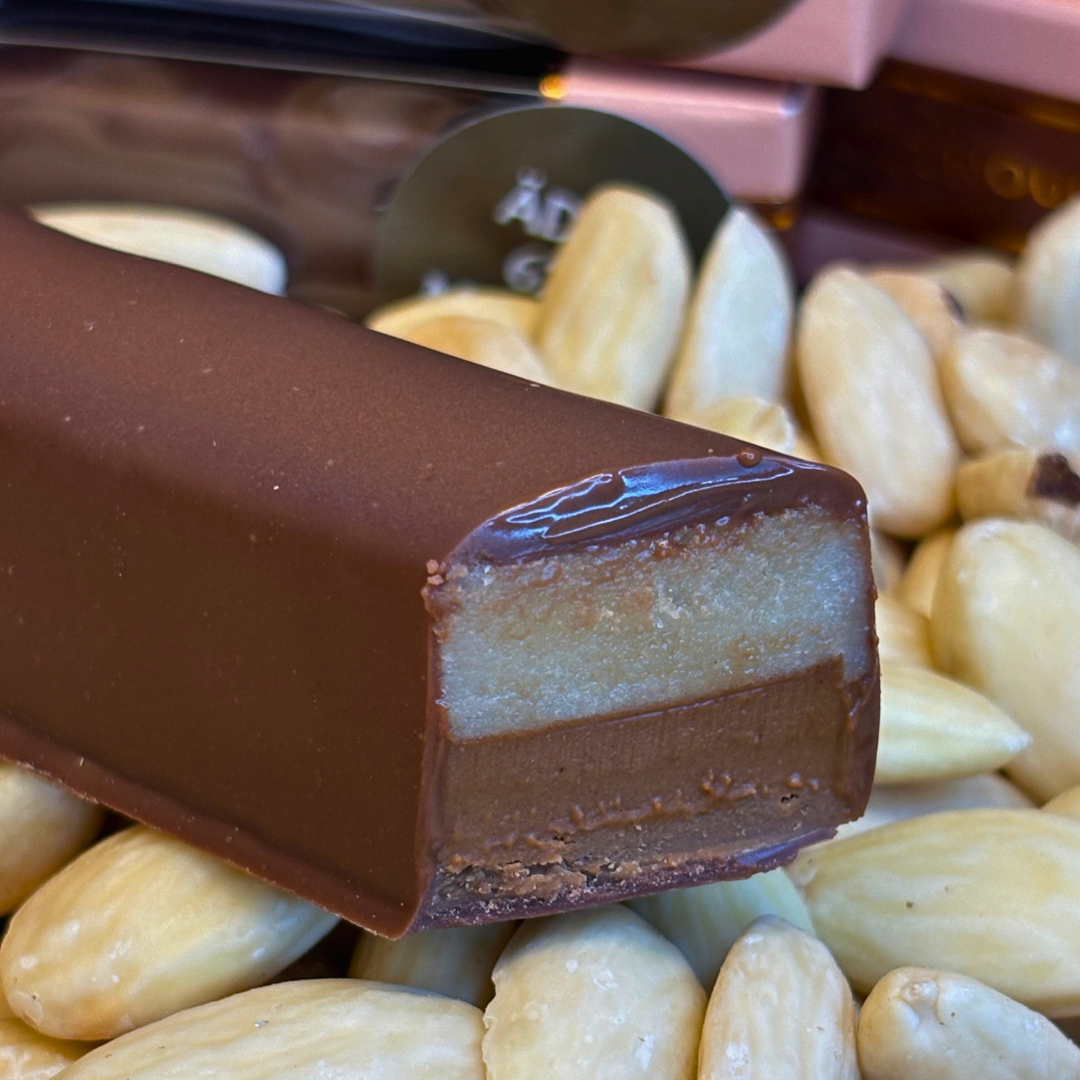 Upptäck våra delikata konfektstänger med två lager av ren njutning! Ett lager består av krämig nötnougat och det andra av härlig marsipan – sedan doppas hela stängerna i len mjölkchoklad för att skapa en lyxig smakupplevelse.