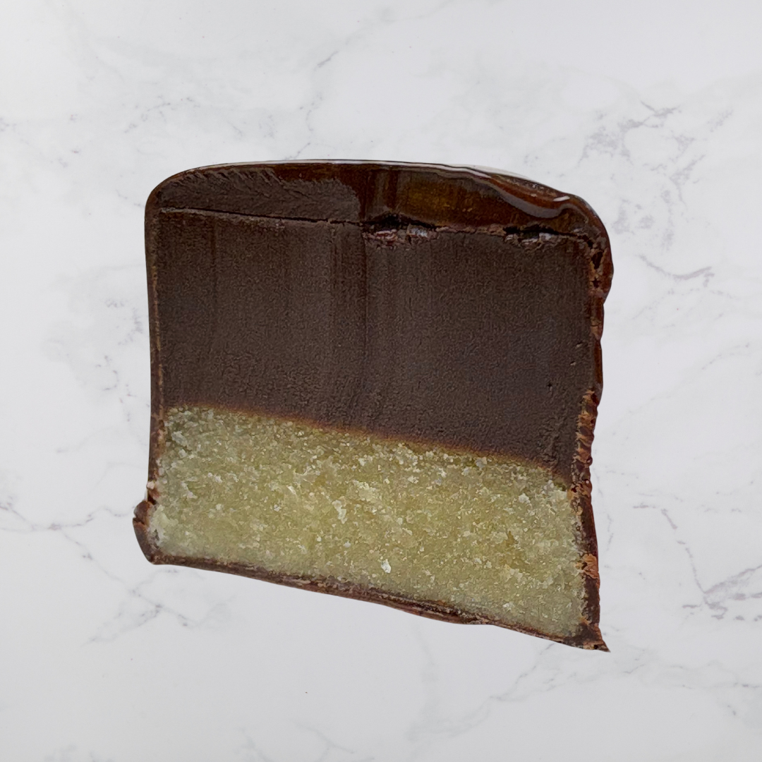 Lyx på en skärbräda! Våra handgjorda konfektstänger består av två lager – det ena är en rik mörk cognacstryffel och det andra är en mjuk och smakfull marsipan. Hela stången doppas sedan i 70% mörk ädelchoklad för en oemotståndlig kombination av smaker. Perfekt att lägga fram på ett fat eller skärbräda och låta dina gäster skära sig en bit.