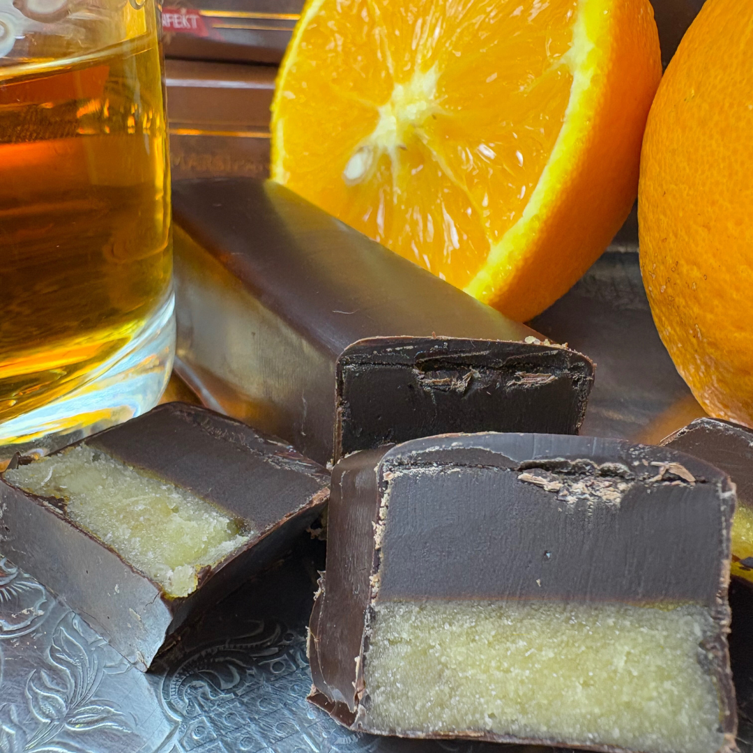 Exklusiva Konfektstänger med Mörk Cognacstryffel och Marsipan – Doppade i 70% Mörk Choklad