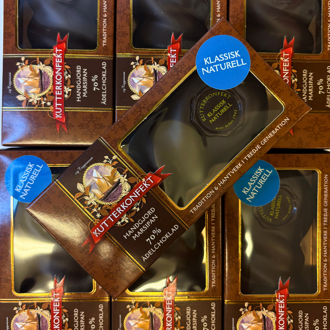 En klassiker från Kutterkonfekt – handgjord marsipanknut i vacker form, doppad i 70 % mörk choklad för perfekt balans mellan sötma och karaktär.