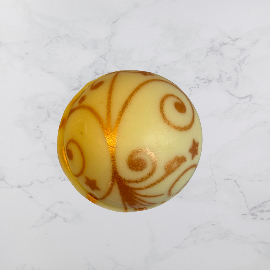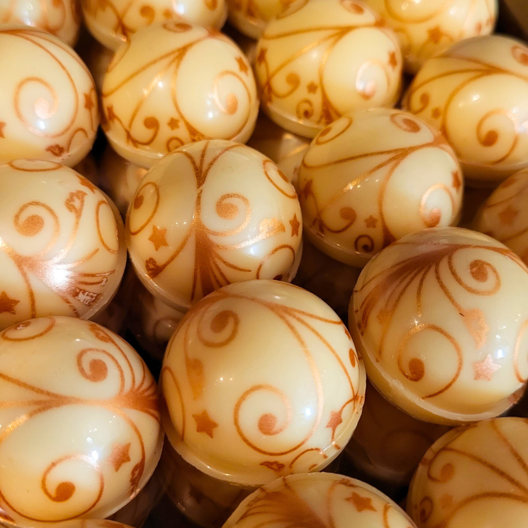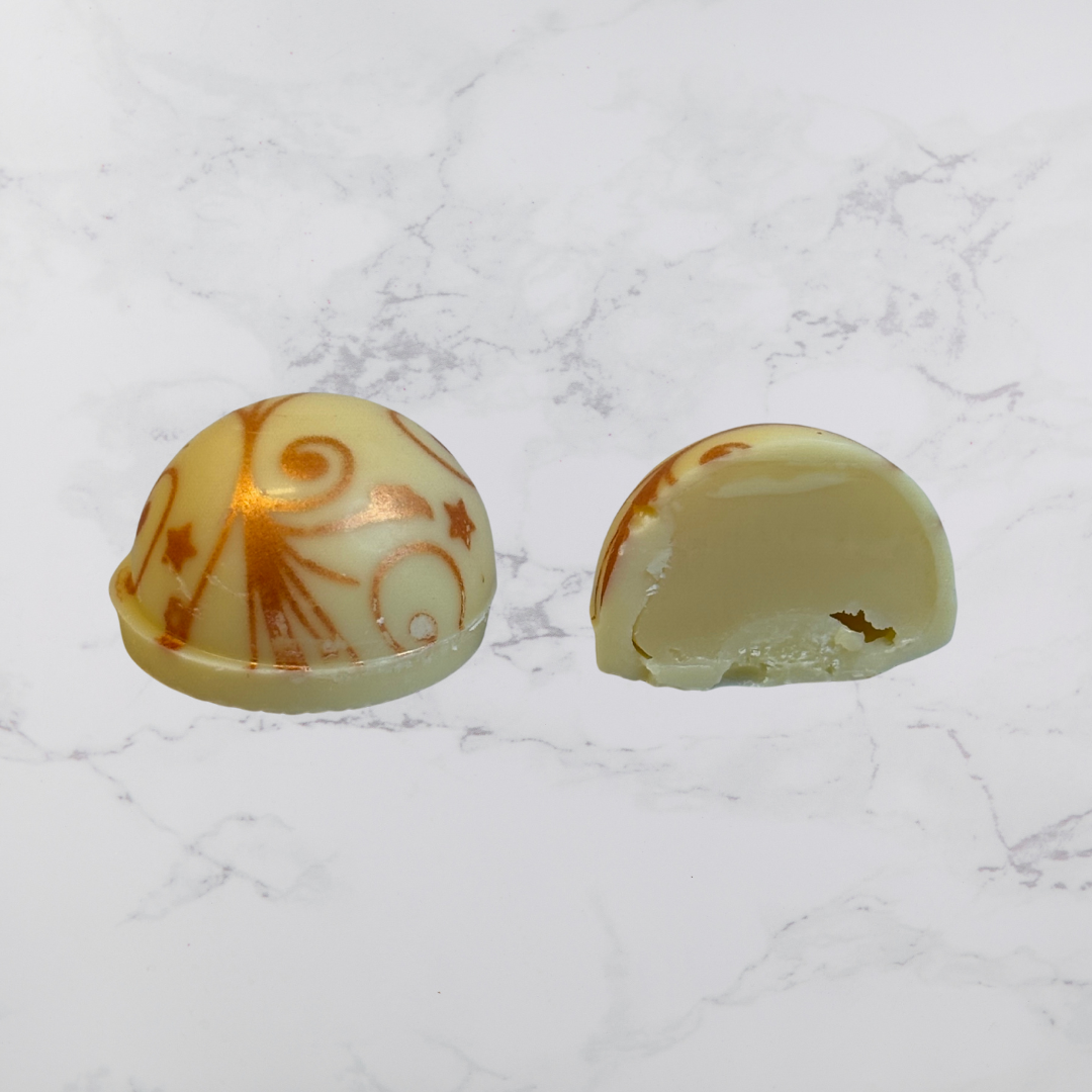 Upplev smaken av solmogna apelsiner och len choklad i vår handgjorda pralin med vit apelsintryffel – en tidlös klassiker som aldrig går ur tiden. Den här pralinen har en fyllig, söt tryffel gjord på vit choklad och apelsin, omsluten av ett vackert mönstrat vitt chokladskal. Resultatet är en fruktig och krämig pralin som sprider värme, glädje och doften av citrus redan vid första tuggan.