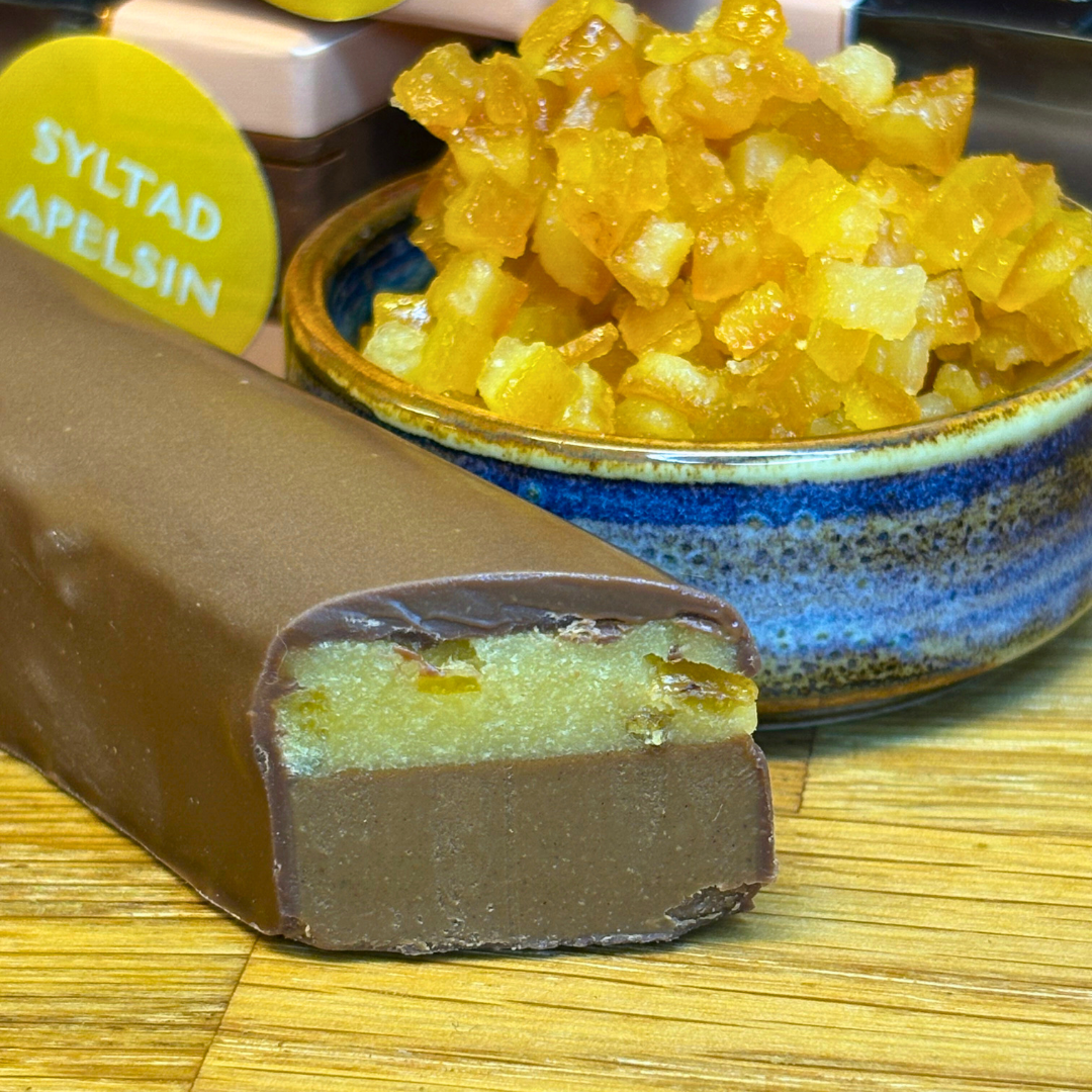 Vår handgjorda konfektstång med syltad apelsin och nötnougat är en smakresa du sent kommer glömma. Här möts söt, mjuk nötnougat och friskt syrlig syltad apelsin i en perfekt balans – allt omslutet av len mjölkchoklad som rundar av upplevelsen på bästa sätt.